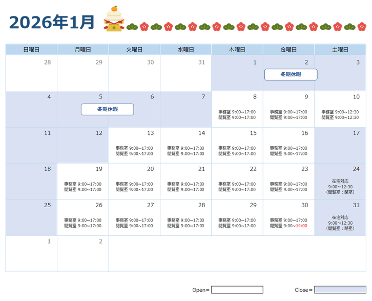 業務状況によっては、開室日時が変更になる場合もございます。
